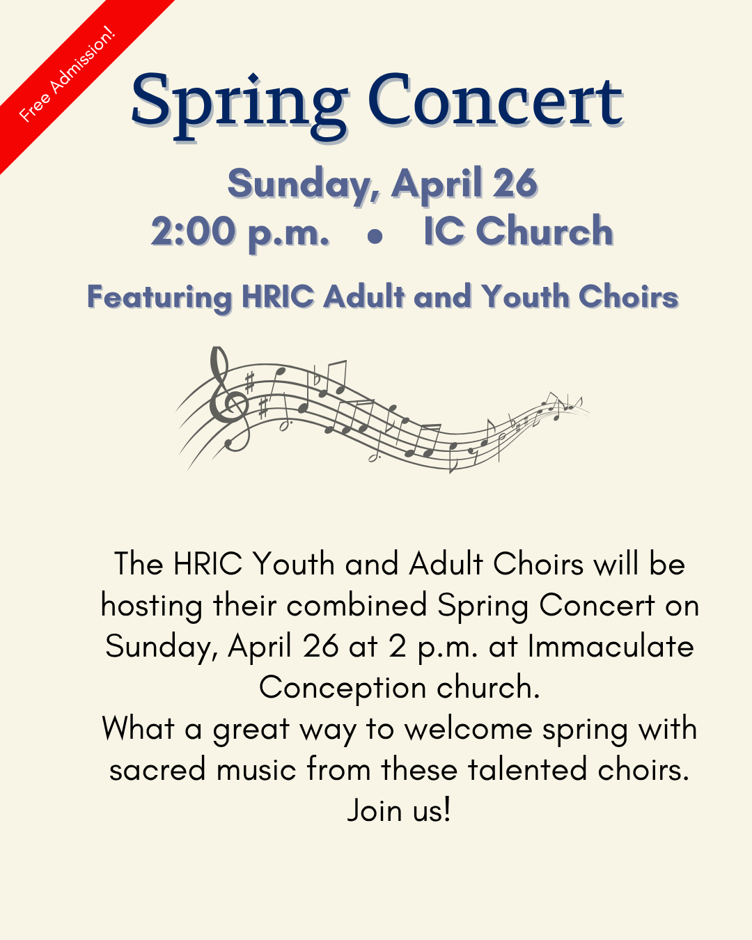 The HRIC Youth and Adult Choirs will be hosting their combined Spring Concert on Sunday, April 26 at 2 p.m. at Immaculate Conception church.