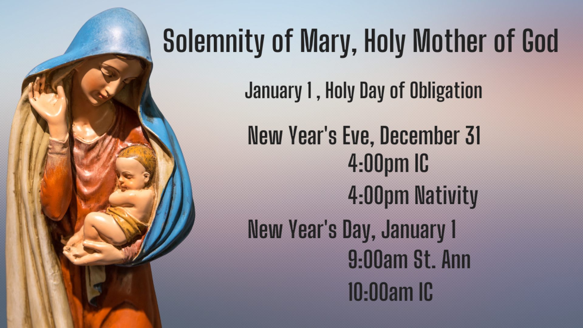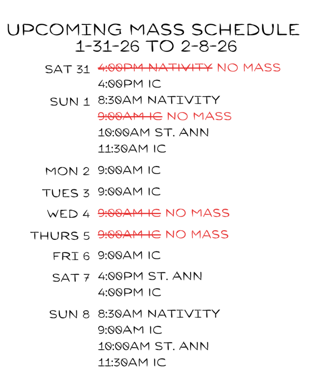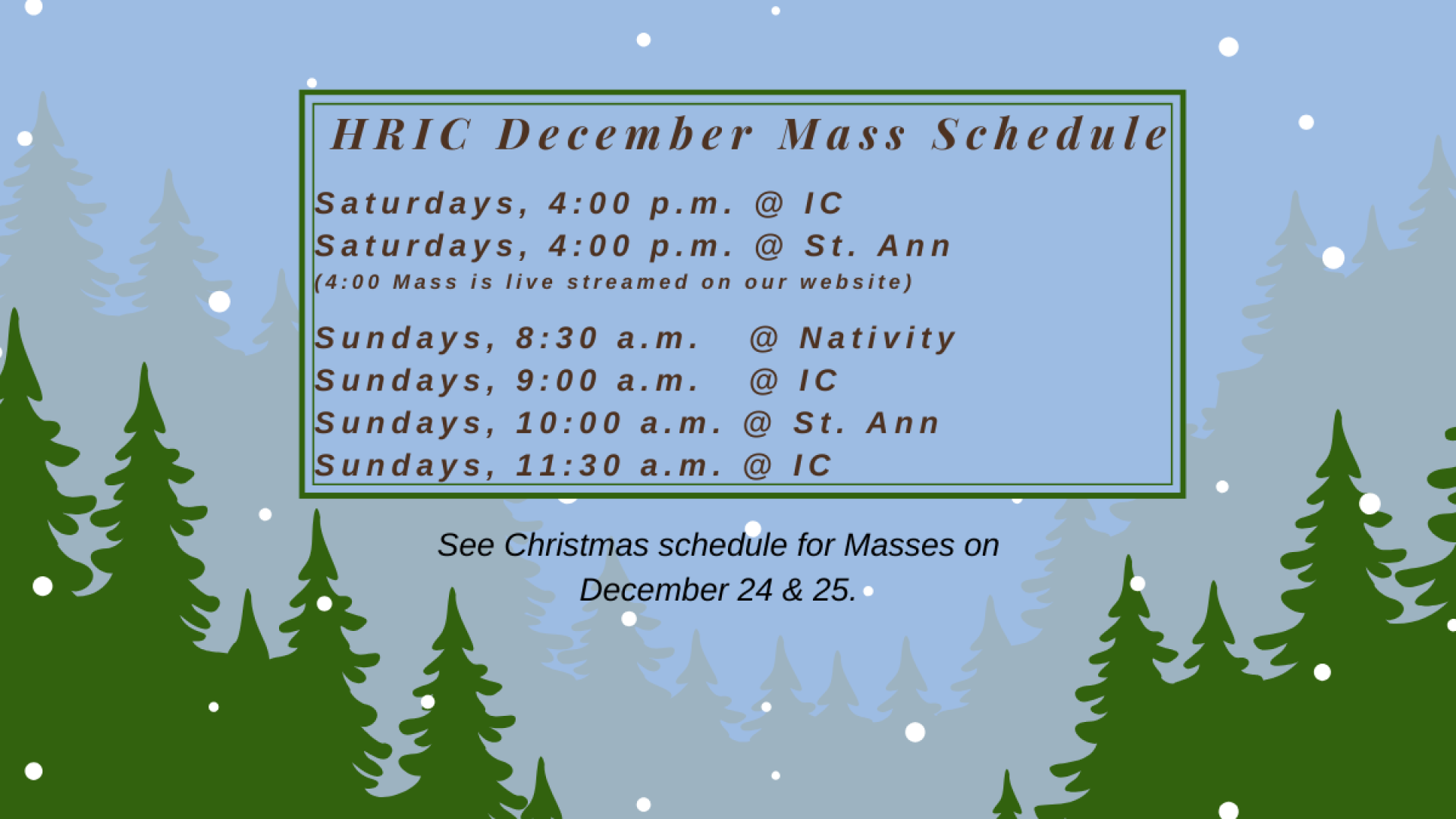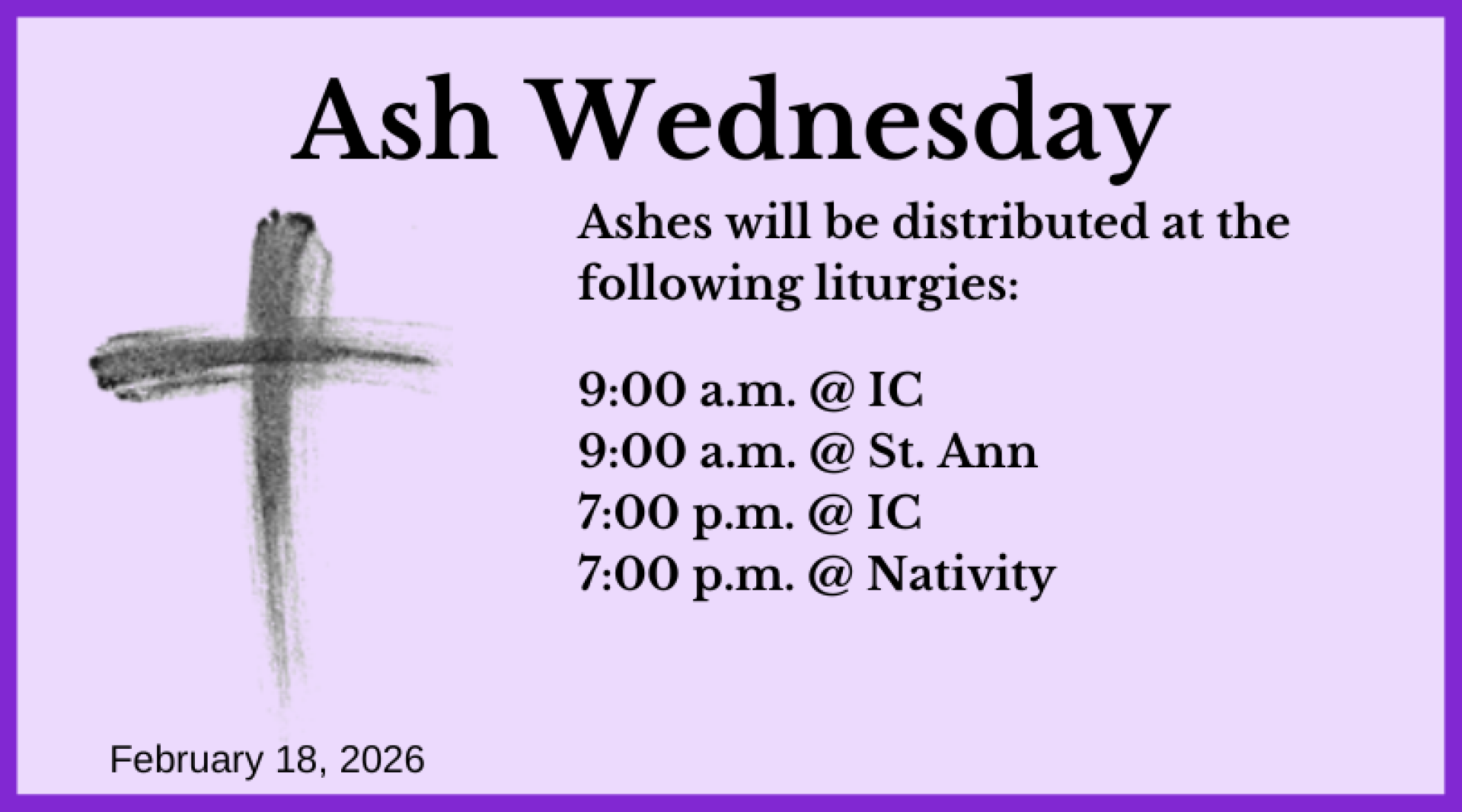 Saturdays, 4:00 p.m. @ IC (Saturday 4:00 Mass is live streamed on Website)